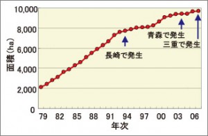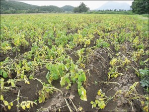 写真はセンチュウの被害で枯れてしまったジャガイモ畑と北海道のセンチュウが発生した畑の面積の推移とセンチュウがどの様に寄生し増えて行くかの図です。